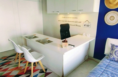 O estúdio está totalmente mobiliado com móveis modernos e elegantes e possui uma confortável cama quem size, perfeita para uma boa noite de sono.