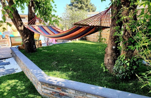 íntima terraza con jardín y una gran mesa a la sombra de los árboles para 8 personas, tumbonas, cama elástica y una hamaca.