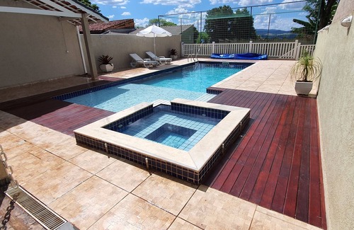 Piscina climatizada y SPA con Hidromasaje en albañilería, LEDs de iluminación interna, todo en Pastillas Portobello, tratamiento del agua con ionización de plata y cobre, lo que hay de más moderno y más sano en cuidados con agua de piscinas, tecnología NASA, sin cloro y ningún producto químico, haciendo su ocio mucho más cómodo y seguro.