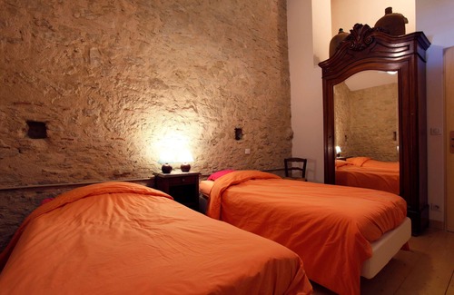 Estas 2 habitaciones de 12 m² con vistas a la terraza o al campo están equipadas con 2 camas individuales, un armario con espejo, una mesita de noche y 2 sillas.
