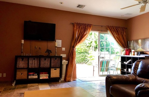 Esta es una casa de huéspedes de dos pisos en la parte trasera de una propiedad tranquila. Los propietarios viven al frente y están disponibles para ayudar a resolver cualquier problema que pueda tener. Incluye una cocina americana (no hay horno) y lavadora / secadora para su uso en el garaje adjunto. Hay un dormitorio principal y un área tipo loft (como segundo dormitorio), revise todas las imágenes. Esta es una casa privada divertida, cálida y acogedora con acceso a una piscina y jacuzzi justo afuera de su puerta. Si su grupo tiene más de 6 personas, tiene acceso a un colchón inflable de alta calidad que puede alojar cómodamente a 2 invitados más. Tenga en cuenta que, según la temporada, la piscina puede tener hojas. Tenemos una persona dedicada a la piscina que viene los viernes, pero los vientos se levantan y soplan hojas de vez en cuando. Hacemos nuestro mejor esfuerzo para mantenerlo limpio, si el clima lo permite.