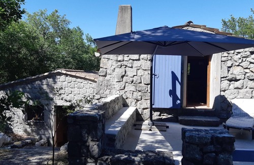 Renovado redil de piedra Ardèche en el pueblo de Chauzon en un terreno privado de una hectárea de encinas, con jardín, estacionamiento, petanca natural, terraza y barbacoa de piedra.