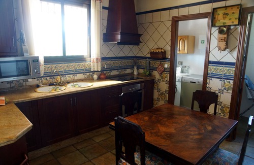 - Una completa cocina, a estrenar, con todos los equipamientos y comodidades de hoy en día: vitrocerámica de 4 fuegos y con campana extractora, frigoriforíco, cocina con todo el menaje, batidora, microondas , HAY HORNO. tostadora, lavavajillas etc. Dispone también de amplia despensa y cuarto de pila con lavadora y termo de gas que asegura el suministro de agua caliente a toda la casa