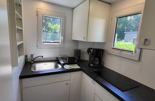 "Tinyhaus 41 Lütt Huus", estudio mobile home. Vivienda adecuada para 2 adultos + 1 niño. Con mobiliario moderno y de buen gusto: salón-dormitorio abierto con 1 cama doble (180 cm, 200 cm de longitud). Cocina abierta (horno, 2 placas de vitrocerámica, hervidor de agua eléctrico). Ducha/WC. Calefacción eléctrica. Terraza 15 m2. Muebles de terraza. El alojamiento dispone de: secador de pelo. Extra. Plaza de aparcamiento (1 coche).