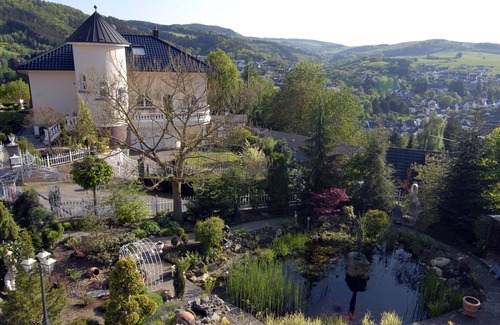 Amplia terraza y balcón con muebles de exterior de alta calidad, elegantes jardines con estanque hermoso jardín y plantar, barbacoa, plazas de aparcamiento disponibles, aparcamiento de bicicletas. Hermoso entorno en el borde del bosque. Totalmente vallada. Magníficas vistas al sur del valle. El centro local de aproximadamente 1 km (tiendas, panaderías, cafeterías, restaurantes, etc.). Parada de autobús a unos 700 metros de distancia. Por el circuito de Nürburgring a unos 4 km. Estación: Ahrbrück a 15 km.