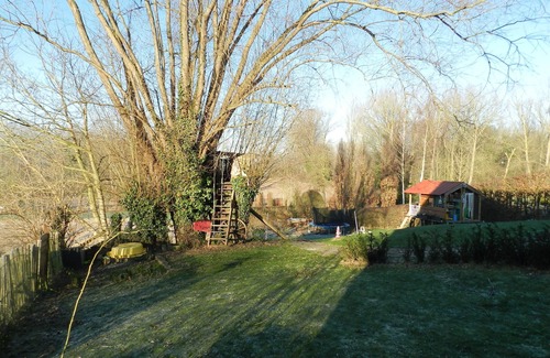 Jardín de 1200m² con tobogán, columpio, cama elástica, casa en el árbol (compartido con los propietarios).