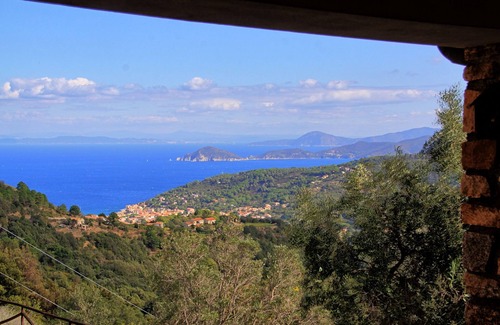 La vista desde aquí cae sobre el encantador paisaje de Elban y el mar, en el valle se puede ver la pintoresca ciudad de Marciana Marina.