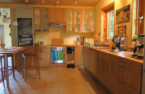 En la cocina están disponibles: lavavajillas, microondas, cafetera, máquina de café espresso, cafetera, tostadora, vitrocerámica con horno, nevera con congelador y un montón de vajilla, cubiertos y utensilios de cocina. Para nuestros pequeños huéspedes hay platos y baberos extra para niños. En la mesa del comedor hay una silla alta lista. Para el hermano, que todavía es demasiado pequeño para sentarse en la silla, hay un asiento elevador separado para la silla normal.