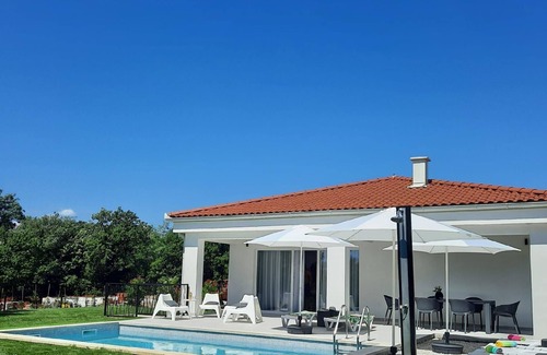 En el exterior, una terraza parcialmente cubierta con muebles de jardín, tumbonas y una piscina de 8 x 4 metros invitan a relajarse. La zona de barbacoa en el jardín es perfecta para disfrutar de acogedoras veladas. Dos plazas de aparcamiento privado están disponibles directamente en frente de la casa, y la ubicación de la villa hace que sea el punto de partida ideal para excursiones a los lugares más bellos de Istria.