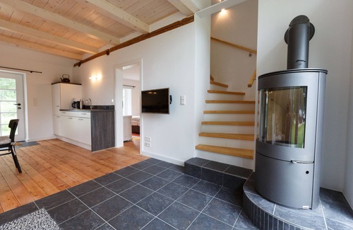 Se trata de un apartamento de aproximadamente 75 metros cuadrados en dos plantas con dos áreas para dormir. Un dormitorio con cama doble se puede encontrar en la planta baja con un aseo de invitados contiguo. Usted entra en la cocina con mesa de comedor y en la sala de estar con grandes ventanales y estufa de leña durante horas agradables. A través de una escalera se llega a la galería para dormir con una gran cama doble, que también se puede usar por separado como camas individuales. El cuarto de baño con un montón de espacio de almacenamiento y gran espejo frontal se puede encontrar aquí.