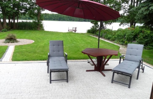 Fantástico bungalow de 42 m2 con playa privada y un pequeño muelle. La casa tiene dos dormitorios, una sala de estar, una terraza acristalada, un baño con ducha. La casa está totalmente equipada con lavavajillas, lavadora, TV y una cocina de inducción con horno. Para los turistas están disponibles tres Fahrreder, una canoa, un pequeño velero y una parrilla. Es un lugar maravilloso para los amantes de la naturaleza, 1500 m2 de jardín bien cuidado con chimenea. A su disposición hay una playa de 18 metros de largo.