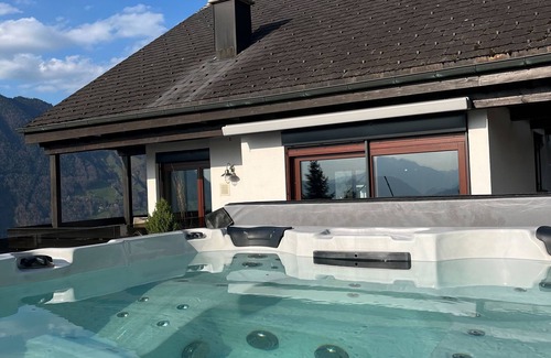 Un gran jacuzzi/bañera de hidromasaje con sistema de contracorriente es un sueño para nadar y bañarse. Relájese en la cálida bañera y disfrute de la vista lejana del lago y de las impresionantes montañas del panorama (Pilatus, Bürgenstock y el Rigi).