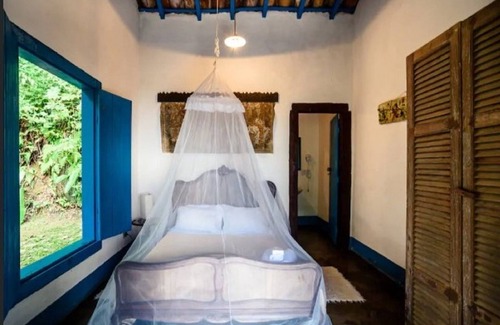 Charmosa casita en estilo caiçara en medio de la Mata Atlántica en Borrifos en una costa en el sur de la Ilhabela. Alojamiento para dos personas en cama de matrimonio, suite, lavabo, cocina completa con fogón cuatro bocas, nevera, fornito eléctrico, tostadora, cafetera, servicio de ordenadora, TV Sky, wifi. Decorada con obras de arte. Frente al mar proporciona una integración completa con la naturaleza. Lugar ideal para contemplar, meditar, observar pajaritos, el mar. Costera excelente para la pesca y el buceo. Alojamiento para hasta 3 personas.