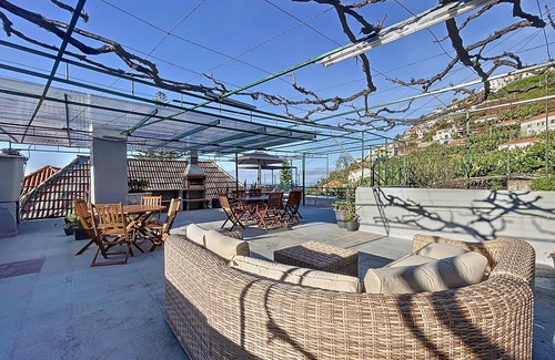 La terraza tiene el área de toda la casa, con muebles de exterior y vistas a la montaña y al mar.
