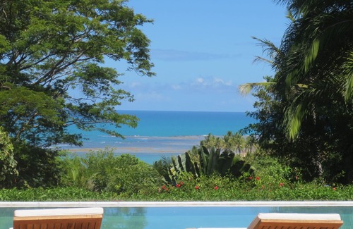 Encantadora casa con vista al mar, con 3 cuartos para 6 personas, localizada a las afueras de Trancoso, en un condominio privado, con acceso a la playa de Itapororoca. Magnifico jardin tropical de 5.000 m2.