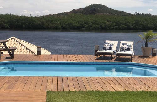 Casa estructurada de 450M2 Ser: 06 habitaciones, 04 suites, con camas King, cama individual, tiene capacidad para 15 personas, balcón de 40m2, acogedora pérgola cubierta, muelle, piscina, quiosco en Beira do Rio, con playa privada