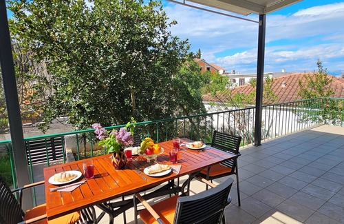 La casa está en el primer piso y se accede por escaleras exteriores y está estrechamente conectada con el jardín. Cuenta con una gran terraza de 25 metros cuadrados para disfrutar de relajantes comidas. Y afuera hay un hermoso jardín mediterráneo de 200 metros cuadrados con flores y plantas, y una gran higuera que fructifica en agosto y que los huéspedes pueden disfrutar.