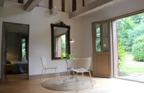 Ubicada entre viejos árboles, campos y bosques, en un gran parque sin vallar, esta antigua casa familiar con mampostería a la vista, vigas antiguas y pisos de parquet, está clasificada 4 ****, muy agradable y fresca en verano.