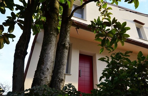Una parte de una casa adosada con una entrada independiente, que reconocerá fácilmente por la puerta de un brillante color rojo Ferrari.