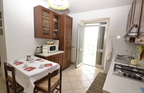 Puede entrar en la cocina desde el salón a través de un pasillo. Está equipada con cuatro quemadores de gas, un horno eléctrico, una heladera con freezer, microondas, cafetera y otros pequeños electrodomésticos. Hay una chimenea práctica. Hay una mesa para dos. Desde la cocina se introduce la terraza a través de una puerta francesa.