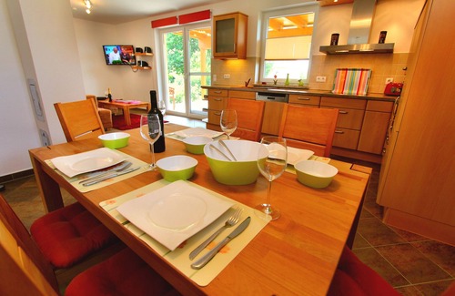 ..... Seensucht? Encontrará paz y relajación en la casa de vacaciones MÜRITZBRISE / comfort-EC-comfort en una ubicación muy tranquila en Klink ..... La casa de vacaciones de confort MÜRITZBRISE en un lugar tranquilo (al final de una carretera de juego) tiene un total de 2 apartamentos de lujo separados y de alta calidad y se encuentra a poca distancia de la hermosa playa de arena de Müritz. El apartamento de 90 m² en la planta baja, confortable y de alta calidad, cuenta con una amplia sala de estar y comedor con mucha luz, cocina totalmente equipada y abierta, 2 habitaciones confortables con camas dobles y 2 baños modernos. La sauna de la casa está disponible para el uso gratuito de ambos apartamentos en la casa de vacaciones Müritzbrise disponible. En la sala de estar, puede relajarse en un cómodo sof�� esquinero (sofá cama) y experimentar frente a la gran pantalla plana Full HD de pared, más. Sistema de alta fidelidad con reproductor de DVD integrado para disfrutar de la televisión de manera relajada. También hay acceso gratuito a Internet inalámbrico de alta velocidad disponible. Desde la sala de estar, se ingresa a la terraza cubierta de 30 m² con un hermoso jardín bien cuidado y cuidado (para uso exclusivo). El área de comedor con una gran mesa de comedor para hasta 6 personas y la cocina completamente equipada y abierta armónicamente integrada en el salón y comedor lo invitan a reunirse en un ambiente exclusivo para sentirse bien. La cocina abierta y totalmente equipada hace que el coraz��n de cada chef aficionado palpite más rápido gracias a su equipo completo y de alta calidad (lavavajillas, microondas, nevera / congelador, vitrocerámica con horno, cafetera, tostadora y hervidor). Suficientes vajillas, cubiertos, vasos, ollas, sartenes y muchos utensilios útiles completan el equipo. En las 2 cómodas habitaciones separadas, usted duerme en cómodas camas dobles (180 x 200 cm) incl. Ropa de cama (almohadas y edredones) y colchones de alta calidad. Amplios armarios para guardar su armario de fiesta y persianas opacas están disponibles en las dos habitaciones. La ropa de cama está disponible como una opción. Una cama adicional para 2 personas más está en el sofá cama (incl. Ropa de cama / almohadas y edredones) en la sala de estar posible. También se ofrece el alojamiento de un bebé en una cuna de viaje (opcionalmente reservable) en una de las habitaciones. Los 2 baños (1 x baño completo (bañera y ducha) y 1 x ducha) están equipados con azulejos de alta calidad, tocadores, baños colgantes y calentador de toallas. Comience el día con una ducha refrescante o disfrute de un baño de burbujas en los días más fríos. Una vez más, la calefacción por suelo radiante garantiza un calor agradable. Toallas y batas de baño están disponibles como una opción. La sauna con ducha (en el piso / compartiendo el OG-Fewo) lo invita a relajarse en la sauna (el juego de sauna = albornoz y toalla de sauna son opcionales). Toda la casa se calienta por una calefacción por piso ajustable por habitación (calefacción central de gas), por lo que los pies fríos no tienen oportunidad aquí. La terraza cubierta de 30 m² promete horas de relax y se puede usar bien incluso bajo la lluvia. En 2 tumbonas puede disfrutar de la paz y la relajación, tomar el sol o utilizar esto después o entre las sesiones de sauna. Termine la noche con una buena copa de vino en los cómodos muebles de jardín. Diversión a la parrilla en la parrilla de carbón en el área del jardín.