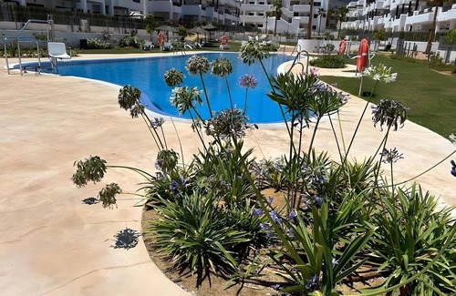 Apartamento encantador y alegre con piscina comunitaria en San Juan de los Terreros, Andalucía, España para 6 personas. El apartamento está situado en un complejo vacacional con bar y restaurante, en una zona costera y montañosa, cerca de supermercados y una pista de tenis, y a 500 m de la playa.El alojamiento ofrece un jardín comunitario con césped y árboles, con vistas a la piscina, el jardín, la calle y otros edificios. La proximidad a la playa, lugares para ir de compras, actividades deportivas, sitios para salir, monumentos y cultura hacen de este un excelente apartamento para pasar sus vacaciones en España con familia o amigos.Exterior del apartamentoParcela cerradaPiscina comunitariaPiscina para niñosJardín comunitario con césped y árbolesZona de juegosTerraza cubiertaDucha exteriorZona de comedor exteriorPlaza de parking privada y cubiertaServicios y zonas comunes incluidos en el precio del alquilerJacuzzi exteriorServicios y zonas comunes con suplementoGimnasio y pista de pádel