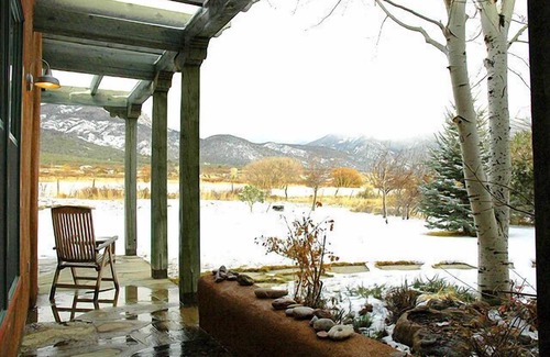 Casa Miguel, casa de lujo con vista de adobe, en la hermosa comunidad de Los Altos de Taos, Nuevo México, se encuentra en Taos Ski Valley Road. Esta casa de vacaciones Taos está bellamente decorado con una mezcla de muebles locales e importados suroeste hechos a mano. El salón dispone de magníficas vistas de la montaña de Taos y un acogedor romántica chimenea kiva central.