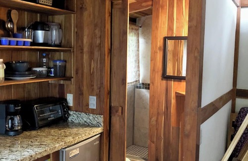 Casa Pagoda is a beautiful hand-crafted teak timber framed Ecosita (ecological casita), built using traditional Japanese design and joinery details and all locally sourced natural materials. The two tiered design is reminiscent of a Japanese Pagoda, hence the name. The upper loft can be used as your private yoga floor, or as a bedroom-with-a-view, accommodating a double bed. The fully equipped kitchen boasts beautiful granite countertops, gas range, and all the utensils, stainless steel cookware and appliances necessary to prepare even the most robust gourmet meals. The Ninga blender is a favorite for blending your favorite smoothie using the fresh local fruits. If your timing is ripe, you may find ripe mangos on tree right outside your door.