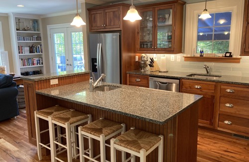 Esta casa de vacaciones decorada y diseñada profesionalmente es ideal para una escapada tranquila para una o dos parejas o para unas divertidas vacaciones familiares. Ubicado en un tranquilo camino de tierra, estarás lejos del ruido del centro de Oak Bluffs, ¡pero a solo cinco minutos a pie de toda la acción! La playa Jetty también está a menos de una milla de distancia, por lo que es fácil llegar en automóvil, bicicleta o a pie. Hay dos master suites en el segundo piso, ambas ofrecen lujosas camas king y un dormitorio adicional con una cama queen. La suite principal 1 tiene un baño privado, mientras que la suite principal 2 tiene acceso privado a un baño compartido, y una oficina en casa (con wifi e impresora / escáner) en caso de que necesite realizar algún trabajo durante su semana de vacaciones. Y, si el clima es demasiado caluroso y bochornoso, ¡aún dormirá profundamente con el aire acondicionado central! Para su comodidad, una lavadora / secadora de tamaño completo se encuentra en el segundo piso.