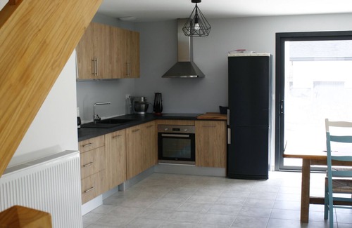 En la planta baja: un dormitorio con 1 cama de 140, un baño y un aseo y un trastero con lavadora junto a un garaje para guardar bicicletas, ... Una sala de estar con cocina abierta equipada con: lavavajillas, horno, microondas, nevera / congelador combinados, procesador de alimentos, cafetera, tetera, tostadora.