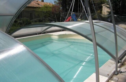 Está cubierto a media temporada que calienta el agua y le permite bañarse desde abril hasta mediados de octubre.