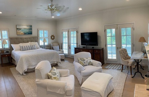 Arriba está la suite principal expansiva con una cama king, chimenea acogedora y un spa como baño de mármol. En la planta baja hay otro dormitorio principal con su propio baño de mármol Carrera y cama queen. Dos dormitorios adicionales (uno con una reina y el otro con dos camas individuales) y un baño de mármol Waterworks de hermoso diseño completan las áreas de descanso de la planta baja. Todas las habitaciones (y camas) son lujosas, serenas y cómodas.