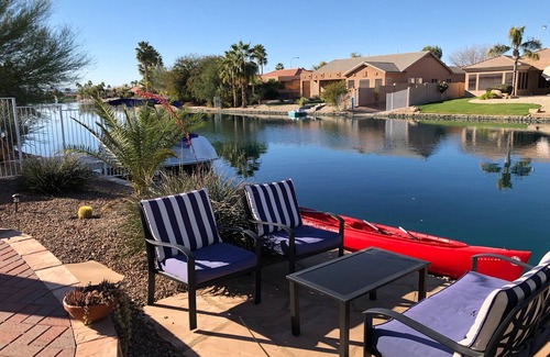 Nuestra casa es un oasis cómodo y tranquilo frente al lago que está cerca del golf, tiendas y excelentes restaurantes. Tenemos una hermosa piscina, gran patio al aire libre que está completamente a la sombra, con mesa de comedor y sala de estar / TV al aire libre. Puede disfrutar de sus relajantes noches pescando y liberando pesca de róbalo, leyendo un libro de nuestra biblioteca surtida en la hamaca o acercándose a la mesa de fuego viendo su programa favorito en el gran patio. La casa ofrece una cocina cereza actualizada con encimeras de granito, barra de asientos para 4 y una mesa de comedor cerca. Tenemos dos salas de estar, comedor formal y 4 dormitorios. También tenemos una pequeña cama doble en la oficina. El dormitorio principal cuenta con un espacio luminoso y luminoso con TV de 55 ", colchón Tuft y Needle King, baño principal grande y amplio vestidor. Las otras 3 habitaciones cuentan con camas queen y todas las sábanas y muebles nuevos. Esta casa tiene muebles de diseño NUEVOS y estamos orgullosos de nuestra casa. Nos encanta tanto nuestro tiempo aquí y estamos felices de compartirlo con otros para unas soleadas vacaciones de invierno. Estamos expuestos al norte y al sur y nuestra piscina y patio miran al norte, tan a la sombra en esos días calurosos, pero la piscina recibe un gran sol. El equilibrio perfecto! Estamos muy cerca de varios campos de golf públicos, incluido el famoso Ocotillo Golf Club. También está el campo de golf de Oakwood, el complejo de golf Bear Creek y el club de golf Whirlwind. Tantos para elegir cerca. Tenemos Safeway justo al otro lado de la calle del vecindario y muchos restaurantes geniales con 1 milla. ¡Ven a disfrutar de la paz y la tranquilidad en esta escapada frente al lago! Tenemos una política firme de no fumadores y firme no mascotas.