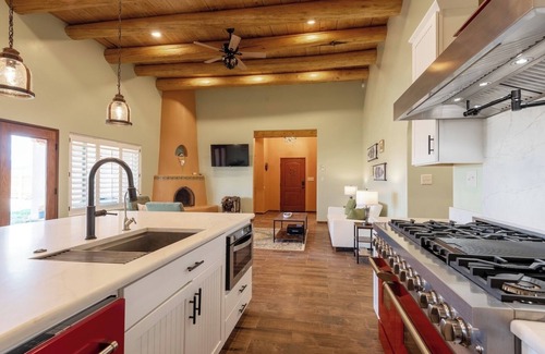 Step inside this Pueblo Revival-style home to find a spacious and airy great room featuring a traditional Vega ceiling made of hewn boards and log beams. A kiva fireplace sits in the living room beside 2 comfortable armchairs, providing a cozy atmosphere for relaxing with an après cocktail. Opposite is a soft couch, where guests can sit back and relax while streaming a movie on the 50” Roku TV. A large table to the side has 2 benches and seats up to 6 for shared meals. Steps away, the modern kitchen is equipped with an oversized center island and high-end appliances. Double glass doors lead to the covered back patio with 3 chairs and a view of the stunning vista. When it’s time to turn in for the night, retire to the luxury primary bedroom with a king bed and Roku TV or the serene guest bedroom with a queen bed—both have private bathrooms. For additional sleeping arrangements, 2 full-sized sleeper sofas can be found in the office and main living area. Keep athletic gear fresh for the next adventure with the convenient laundry room!