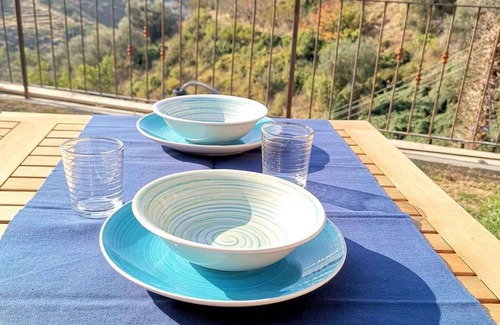Casa vacacional decorado en tonos azules. Junto a la piscina con vistas al mar | Apartamento en Pompeiana