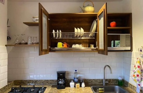 La casa cuenta con 1 habitación; 1 baño con agua caliente; 1 cama queen; 1 cama sencilla; escritorio; closet; Wifi; sala de estar; Tv; cocina dotada; terraza. A tan solo a 7 minutos de Villa de Leyva (2,5 km).