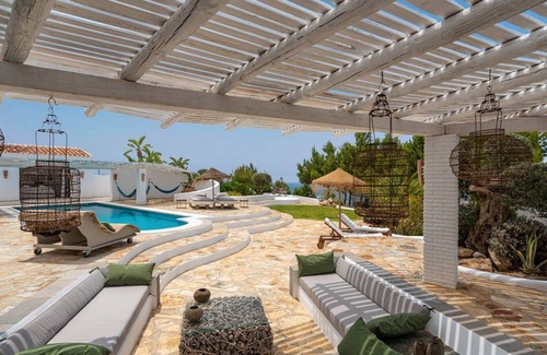 La zona exterior cumple las expectativas que todo huésped tendrá después de haber visitado la zona interior. De hecho, aquí encontrarás varios rincones de ensueño donde disfrutar de su tiempo libre. Un techo de vigas de madera de color claro pone a la sombra una zona de chill-out, la mesa de comedor exterior y parte de la piscina privada. Una barbacoa cubierta es una excelente opción para preparar tus comidas, mientras que las tumbonas y las camas situadas en el exterior te permitirán disfrutar de las vistas asombrosas mientras tomas el sol. Y hablando de vistas, la posición de la casa en lo alto de una colina garantiza unas impresionantes vistas panorámicas a la campiña y al embalse de la Viñuela al horizonte. Una enorme ducha exterior y un jardín perfectamente cuidado con vegetación mediterránea añaden un toque especial a todo el conjunto.