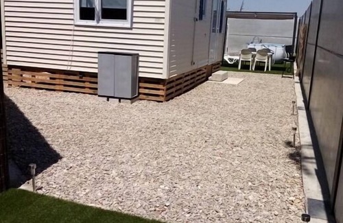 Se trata de una Mobil Home de dos habitaciones una de ellas con cama de matrimonio de 135 cm y la otra individual de 80cm. Encontraréis un sofá cama para dos personas en el salón, cocina completamente equipada, lavadora (bajo coste) y baño con placa de ducha.