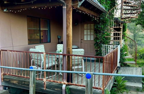 Casita Indigo es un lugar increíble para alojarse si te gustan las vistas y las estrellas. El dormitorio tiene una cama king, chimenea eléctrica, iluminación regulable y terraza con bañera de hidromasaje. También puede descansar en la terraza del dormitorio. Hay otras dos cubiertas, una fuera del área de la cocina-comedor con una mesa de patio con 4 sillas y parrilla eléctrica y luego otra en el techo ... ¡aquí es donde se miran las estrellas! También cuenta con tumbonas y una hoguera a gas. La sala de estar tiene un televisor de alta definición y un reproductor de Blu-ray con Netflix. WIFI te mantiene conectado con lo que está sucediendo en cualquier otro lugar. Una gran chimenea de gas en la sala calienta la Casita en invierno; un enfriador evaporativo lo hace cómodo en verano. También hay una unidad de ventana A / C en la cocina. La cocina tiene todo lo necesario para cocinar tanto como quieras. El baño completo tiene bañera / ducha y tocador doble. Un tocador adicional se encuentra en el baño. El senderismo comienza en la puerta principal. Pasee por la orilla de Lynx Creek disfrutando de la exuberante vegetación, la vida silvestre y las fragancias riparias y aromáticas. Si el ejercicio está programado, camine sobre la colina y regrese. Lynx Lake está a solo 10 minutos con pesca, pinos altos y alquiler de botes. Las principales tiendas y el centro de Prescott están a solo 15 minutos en automóvil. Casita Indigo es una hermosa propiedad aislada con bañera de hidromasaje privada, 3 terrazas y vistas al cielo. Esta propiedad permite perros. Los perros cuestan $ 15 por perro por noche más impuestos. También hay una tarifa plana de $ 10 que se le da al ama de llaves.