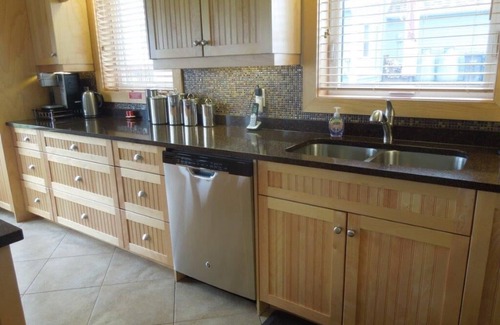 En la espaciosa y luminosa cocina gourmet, los huéspedes encontrarán una gran cantidad de gabinetes de arce personalizados, encimeras de cuarzo, 4 electrodomésticos de acero inoxidable, un complemento completo de pequeños electrodomésticos de Kitchen Aid y Cuisinart (que incluyen una máquina de helados y una máquina de espresso), y una amplia selección de macetas Paderno de PEI. Los huéspedes disfrutarán cenando en una isla de cocina con capacidad para 6 personas en un área de cocina / sala de estar de concepto abierto.