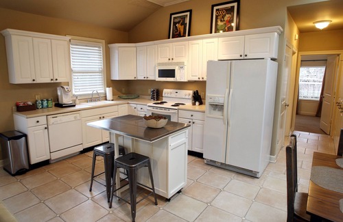 La cocina está equipada con refrigerador, congelador, campana extractora de microondas y estufa / horno eléctrico. Disfrute de una canasta de refrigerios de cortesía y una cafetera Keurig. Island ofrece 2 taburetes de bar. El armario está lleno de vasos, tazas, utensilios de cocina, cubiertos y una gran cantidad de ollas y sartenes para que cocinar sea fácil y conveniente durante su estadía.