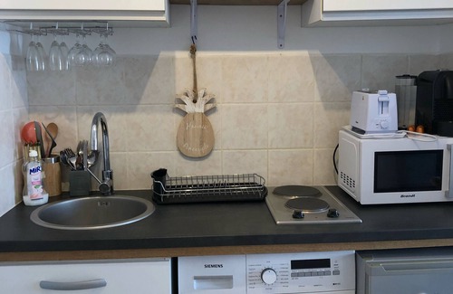 Estudio totalmente equipado (TV, Wifi, ropa de cama, vajilla, lavadora, aire acondicionado, microondas, nevera, vitrocerámica, etc.)