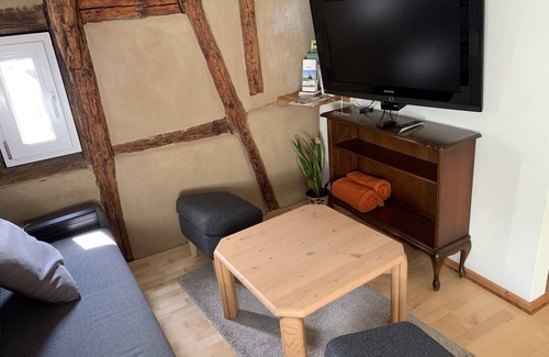 Nuestro estudio de 50 m² gran apartamento / ático está situado en el casco antiguo de Rüdesheim am Rhein. Cocina con zona de cocina, sala de estar / comedor con sofá cama y TV de pantalla plana, dormitorio con cama doble estudio del ático, la luz del día, Wi-Fi. Nichraucherwohnung, se proporcionan cuna / trona, toallas y ropa de cama para ti.