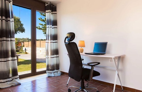Al ingresar a la villa hay una amplia área abierta que consiste en la sala de estar con un cómodo sofá doble (con capacidad para 1 huésped), TV inteligente de 50 pulgadas, chimenea y consola Playstation 3 y una oficina. La cocina totalmente equipada con accesorios de alta calidad y mesa de comedor interior. La sala de estar tiene un balcón al que también se puede acceder al jardín. Luego, al pasar por el pasillo, se encuentra el primer dormitorio a su derecha con una cama doble. Al pasar por esta habitación, hay otra habitación más pequeña separada por una puerta corredera con una cama individual. El segundo dormitorio se encuentra en el lado izquierdo del pasillo con 2 camas individuales que se pueden configurar como una cama doble. Al final del pasillo hay un baño con ducha.