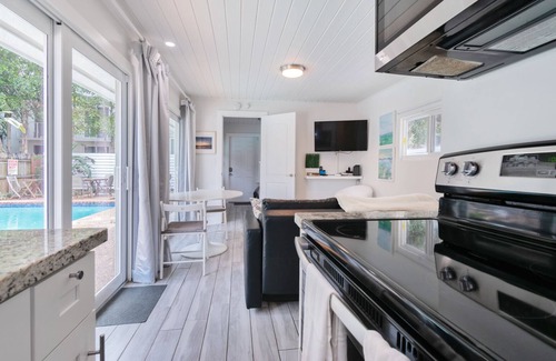 Este apartamento de un dormitorio totalmente equipado y amueblado, con una cómoda cama queen size en el dormitorio, un sofá cama desplegable en la sala de estar y un baño completo, está ubicado a una milla de la mejor vida nocturna, restaurantes y tiendas de la ciudad. Edificio de 3 unidades: solo tres unidades comparten la piscina.