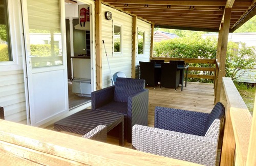 En la gran terraza cubierta encontrará un juego de salón y una mesa de comedor con 4 sillas.