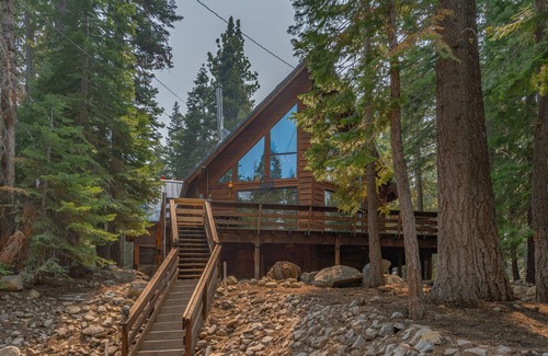 Esta es una bonita casa de Chamberlands con acceso a la playa en Chamberlands. La gran sala es un plan abierto, perfecto para el entretenimiento, y tiene techos altos y grandes ventanales para disfrutar de la vista del bosque y está bellamente decorada con colores que reflejan las claras aguas azules del lago Tahoe. Este 3 dormitorios y 2 baños tiene 2,000 pies cuadrados. Hay una envoltura alrededor de la cubierta. El gran dormitorio principal tiene cama king, baño adjunto, spa y su propia terraza privada. También abajo hay un segundo dormitorio con una cama queen y un tercer dormitorio con dos camas individuales. Esta propiedad tiene acceso a la playa privada de Chamberlands y está a pocos pasos de la playa.