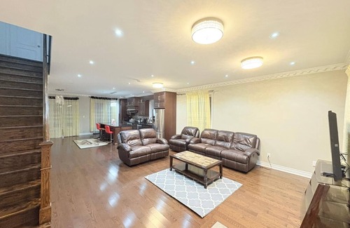 Our home features four spacious bedrooms, each with a private bathroom. The primary bedroom has king-sized bed,while the second , 3rd ,4th offers a queen-sized bed. Relax in the inviting living area, complete with a large sofa and 65-inch TV.Enjoy the outdoors in our tranquil backyard with comfortable seating.
