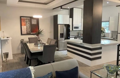 Este alojamiento de 3 dormitorios y 3 baños cuenta con una sala de estar, un comedor, caja fuerte y aire acondicionado. Conéctate al wifi, o relájate frente a un Smart TV. También hay un reproductor estéreo. El cuarto de baño incluye un secador de pelo, toallas y papel higiénico. La cocina está equipada con horno, placa de cocina y frigorífico, además de cafetera y tetera, microondas y utensilios de cocina. Podrás viajar con poco equipaje, porque tendrás una lavadora y una secadora a tu disposición. Otras comodidades incluyen ropa de cama, una tabla de planchar, calefacción y una mesa de comedor.