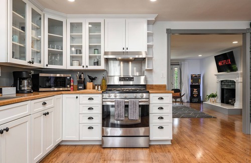 Unwind beside the fireplace in the luminous, expansive living area featuring a sumptuous leather sofa and two chic accent chairs. Enjoy endless entertainment with a Roku TV stocked with Amazon Prime Video, Apple TV, Disney+, HBO Max, Hulu, and Netflix (use your personal account), along with a playful arcade machine for youthful spirits.